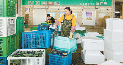 江苏盐城东台市供销合作社领办的农民专业合作社,成为上海大型连锁生鲜超市的供应商。图为合作社工作人员正在将采收的蔬菜称重装箱。 周传胜摄