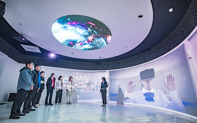 云启智慧科技有限公司展厅内,参观者正在体验融合裸眼3D和虚拟现实叠合技术的智慧教育项目。陈卓摄