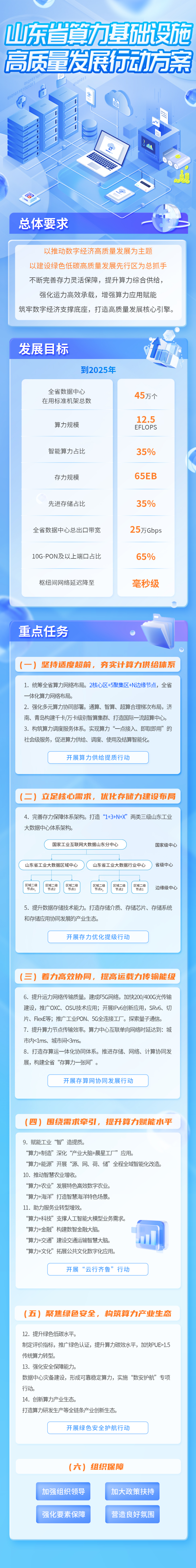 行动方案以推动数字经济高质量发展为主题,以建设绿色低碳高质量发展先行区为总抓手,通过不断完善存力灵活保障,提升算力综合供给,强化运力高效承载,增强算力应用赋能,统筹通用算力、智能算力、超级算力协同计算,大中小城市协同布局,算力、数据、算法协同应用,以筑牢数字经济支撑底座,打造高质量发展核心引擎。方案明确了夯实计算力供给体系、优化存储力建设布局、提高运载力传输能级、提升算力赋能水平、构筑算力产业生态、组织保障等6方面重点任务,部署了算力供给提质、存力优化提级、存算网协同发展、“云行齐鲁”、绿色安全护航等5大行动。