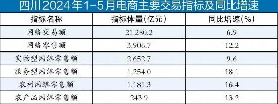 6月17日,记者从四川省商务厅获悉,今年1至5月,四川实现网络交易额21280.2亿元,同比增长6.9%。网络零售额3906.7亿元,同比增长12.2%。其中,实物型网络零售额2652.7亿元,同比增长9.6%;服务型网络零售额1254.0亿元,同比增长18.1%。农村网络零售额1181.3亿元,同比增长16.4%。农产品网络零售额243.9亿元,同比增长13.2%。成都实现网络零售额2712.7亿元,其中,实物型网络零售额1898.5亿元,服务型网络零售额814.2亿元。