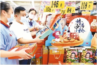 中秋节临近,安徽省淮北市各大商场超市传统食品购销两旺,节日气氛浓厚。图为在淮北市淮海路大润发大型超市内,市民在“中秋大街”卖场选购月饼。 周方玲摄(人民视觉)