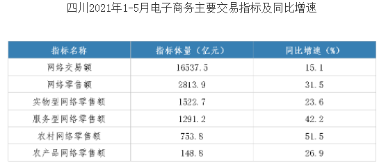 2021年1—5月,四川实现网络交易额16537.5亿元,同比增长15.1%,其中网络零售额2813.9亿元,同比增长31.5%。