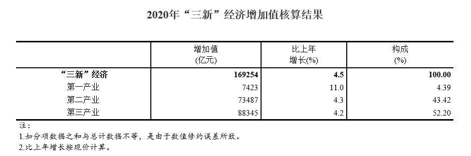 2020年,尽管受到突如其来的新冠肺炎疫情的巨大冲击和严峻复杂国际形势的影响,我国新产业新业态新商业模式仍继续保持增长。经核算,2020年我国“三新”经济增加值为169254亿元,比上年增长4.5%(未扣除价格因素,下同),比同期国内生产总值(GDP)现价增速高1.5个百分点;相当于GDP的比重为17.08%,比上年提高0.7个百分点。