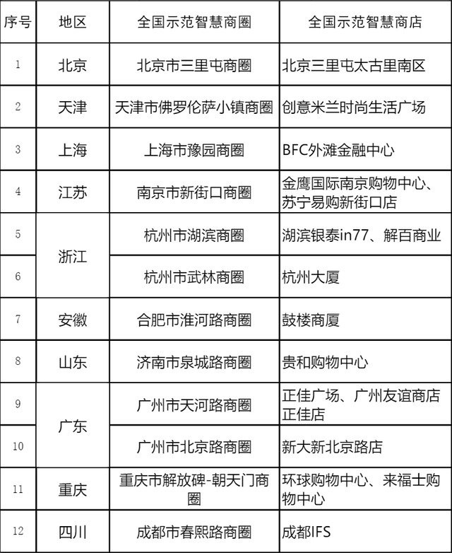 图为首批全国示范智慧商圈、全国示范智慧商店名单(按行政区划序列排序)